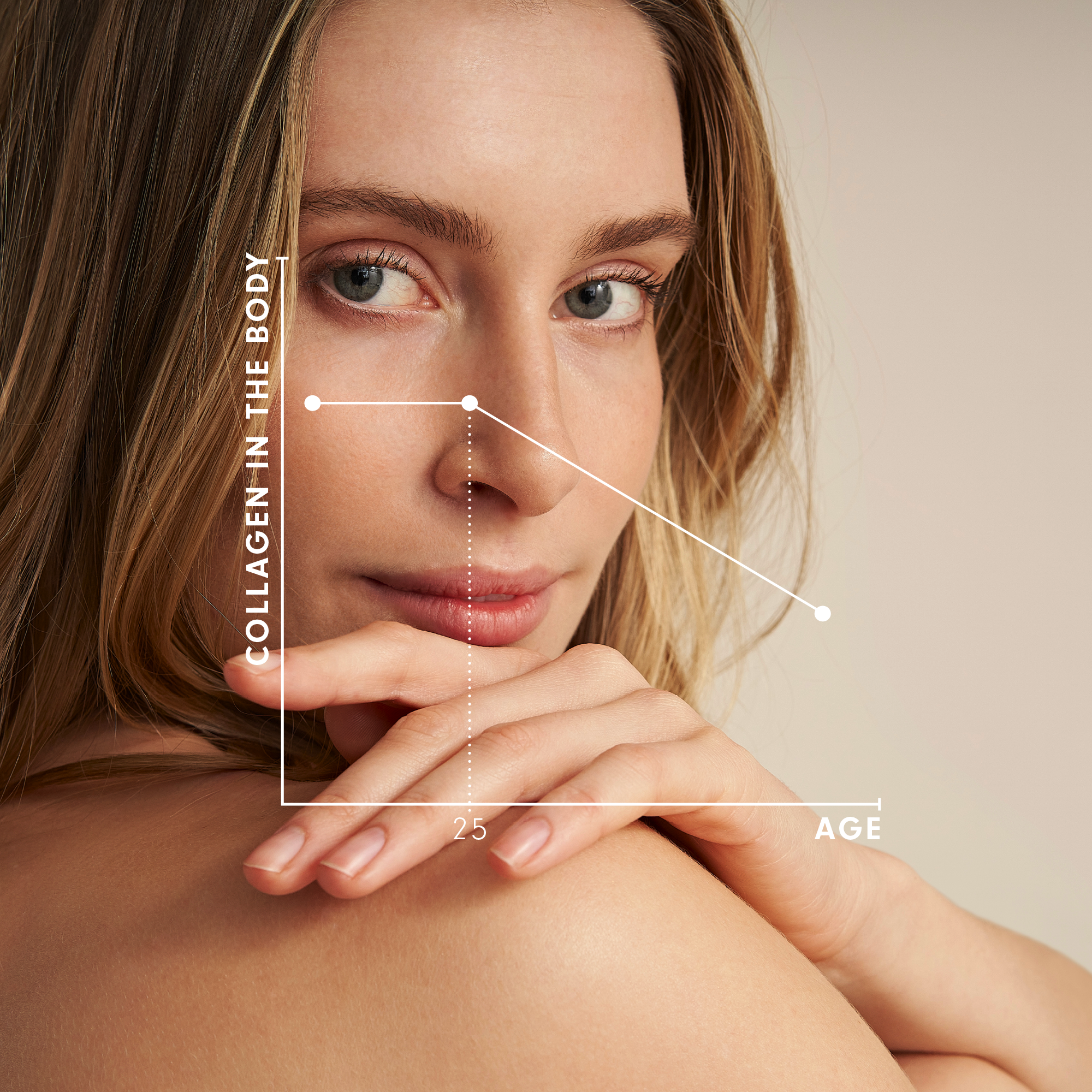As we age, the body's natural production of collagen decline by 1% per year from the age of 25. The declining level of collagen in the skin can be seen as the skin becomes less elastic and wrinkles and fine lines appear. Usually, it is changes in the facial skin that we first notice.