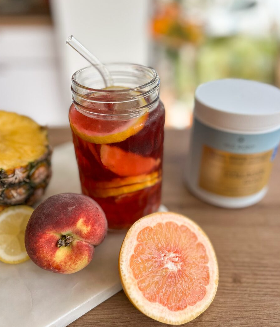 Slice the lemon and peach into thin, delicate rounds. Put the Collagen Gold powder in a glass, add water and stir till the powder has dissolved. Add the fresh fruit to your glass. Drop in the hibiscus ice cubes for a vibrant touch.